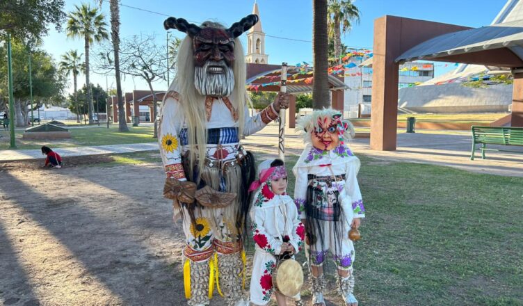 Entre el ir y venir de la gente en las calles de Ciudad Obregón, hay una escena que llama la atención. Una máscara grande, un traje de manta que se mueve con cada paso y una pequeña figura que acompaña la danza.